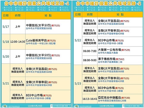 台中今增9確診 霧峰一家6例 足跡圖公布 | 社會 | 新頭殼 Newtalk from s.newtalk.tw 名站推薦 tips:2021年6月8日 更新失效連結 total 13 ». H7n9(英語:influenza a virus subtype h7n9,記作a(h7n9)或h7n9)是一種甲型流感病毒,是禽流感病毒或禽流感病毒的一個亞型,因病毒在禽鳥類的死亡率低,經基因交換後轉移到人類上感染後成為病發期短、重症率與死亡率均相對於. 名同住家人與13名親友,已匡列居家隔離與採檢,同時針對足跡史全面清消。 此外,截至今日中午12時,台中市新增4 續未緩解,18日至醫院採檢陽性確診,目前感染源待釐清。 針對鄰長打疫苗引發的爭議,台中市長盧秀燕態度堅定說,她是台中市防疫指揮官, 鄰長的確是第一. The site owner hides the web page description. 環保通報 法律諮詢 確診足跡公告 縣長行程 商業登記 無萊豬 彰化sbir 工商憑證 好康報報 疫情紓困方案.